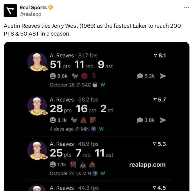 這也是里夫斯開季至今火熱表現(xiàn)的縮影,開季僅花費(fèi)7場比賽,里夫斯已經(jīng)拿到超過200分50次助攻,成功追平杰里-韋斯特(1969年)并列湖人隊(duì)史第一。